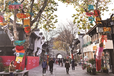 上月30日下午,在衢州古城水亭门历史文化街区的主街上,两侧的树木披上了“新年新衣”,与青砖黛瓦的街巷相映成趣,顷刻间点亮了新年的热闹氛围。本次元旦氛围布置以树木装饰为重点,主街11棵梧桐树设置了不同主题,包括音乐主题、马年主题、元宝主题等。设计融合了古城文化内涵,也突出了节日的喜庆气氛。
