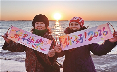 2026年1月1日清晨,市民在河北省秦皇岛市海港区金梦海湾海滩观看日出,迎接新年。 新年第一天,人们伴着朝阳迎接2026年的到来。新华社发