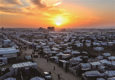2025年12月31日傍晚,在加沙地带南部城市汗尤尼斯,落日余晖洒落在流离失所的巴勒斯坦人栖身的帐篷区。 新华社发