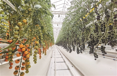 在1.39万平方米的智能连栋玻璃温室里,一排排空中生长的小番茄个头齐刷刷,每株足有两米多高,上面坠满了一串串果子。每株小番茄的藤蔓长得很相似,但结的果子不同,除了常见的红色小番茄外,还有橙色、黄色、粉色、绿色、咖啡色的小番茄,让人目不暇接。最稀奇的是黑色小番茄,它有一个很形象的名字叫“黑玛瑙”,果子晶莹饱满,明显比普通小番茄大,单果重量40克。“红色的叫‘玛索’,黄色的叫‘夏日阳光’,橙色的叫‘小蜜柑’,绿色的叫‘青霞’,粉色的叫‘樱悦’,咖色的‘咖星’,差不多有21个品种。”公司生产助理王歆晨对这里的番茄津津乐道。