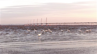 近日,摄影爱好者在嘉绍大桥附近江面上拍到了一群黑脸琵鹭。■大潮拍客 潘玲珑 摄