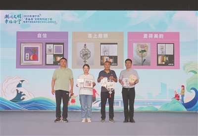 海宁市民间文艺家协会会员、丁桥镇皮贴画传承发展领衔艺人陈海震,为现场观众带来了一场精彩的皮贴画产品发布展示秀。大师级精品、创意文创产品、亲民材料包系列依次亮相,展现了皮贴画从艺术殿堂走向生活美学的华丽转身。现场还举行了皮贴画材料包赠送仪式,丁桥小学代表、村(社)代表、养老服务中心代表上台接过了材料包。