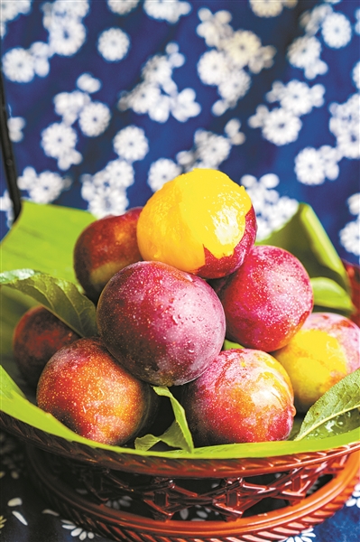 只见紫红透亮的槜李被剥开小口,内里果肉色泽金黄、晶莹似琼浆。轻吮果汁可“一饮而尽”,轻咬一口汁水四溢,浆液入口,色、香、味依次激发,沁心甜润之感持久萦绕。“还有更考究的吃法,在茶盅内放入小片芭蕉叶,将槜李放入其中,合盖静待5分钟再吃,有色更有味。”