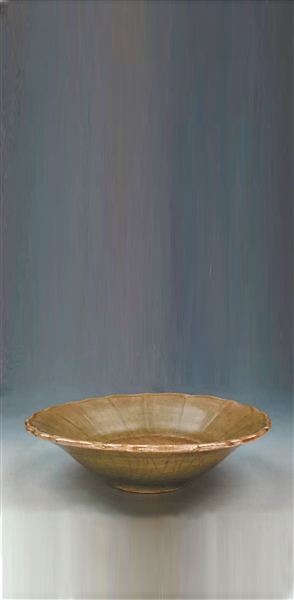 高5.0厘米 口径18.0厘米 足径6.2厘米。葵式敞口,浅弧腹,矮圈足。内壁及底刻划简单荷叶纹。青釉,小开片,外底露胎。