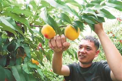 许佳宇今年33岁,这是他种桃的第五年。从一窍不通的“种植小白”到远近闻名的“种桃能手”,他边摸索边学习,从山东、江苏、河南等地引进新品种进行试验种植,从100多个品种里挑选出10多个优质蟠桃、油桃、黄桃品种进行种植,蹚出了一条独具特色的种桃之路。