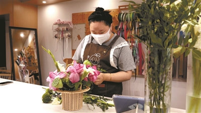 花店店主朱翌婷接过荷花,仔细检查着花材的新鲜度。她认为,荷花作为夏季时令鲜花越来越受欢迎,不仅因为颜值高,更因为它“出淤泥而不染”的品格,还有“荷”你在一起等浪漫寓意。而且,将荷花作为鲜切花销售,还能为本地荷花种植户开辟新的增收渠道。