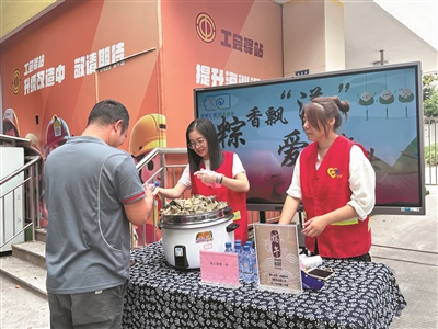 白漾社区户外劳动者驿站为新就业群体送上粽子。