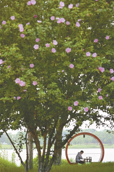 近日,鹃湖之畔,木槿花开正旺,市民选择在绿意间休闲放松,享受惬意与宁静。