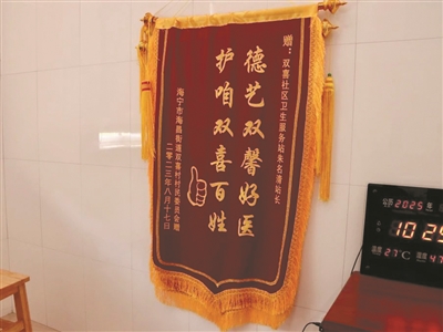 清晨的阳光洒进海昌街道双喜村社区卫生服务站,全科诊室墙上那面写着“德艺双馨好医 护咱双喜百姓”的锦旗在晨光中格外醒目。这面由双喜社区居委会赠予乡村医生朱名清的锦旗,不仅是对他精湛医术和仁爱之心的赞誉,更是他多年来扎根乡土、守护村民健康的最好见证。