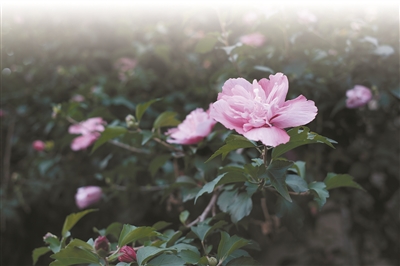 槿树的枝条上会开许多花,那粉色的、红色的喇叭形状的花朵非常好看,以其朝开暮落的独特花性、丰富多样的色彩变化和顽强的生命力成为夏季的亮点。听说最近鹃湖边的槿树花开得很旺,正是赏花的好时节。