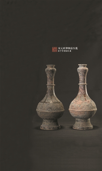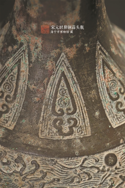 瓶颈中部有一道凸棱,将其分为上下两部分,颈腹交接处环绕着八瓣蕉叶纹,腹部以凸弦纹为界,上部三组海马纹在海浪纹映衬下栩栩如生,下部五组龟背纹则寓有希冀健康长寿之意。此外,瓶子的圈足内侧铸刻着“子子孙孙永宝用”的铭文,可见古人希望此器能够永世流传,后世子孙也一如既往地铭记和珍爱祖先的功德与荣耀,表达了对家族传承及子孙后代的祝福与期望。(图文来源海宁市博物馆)