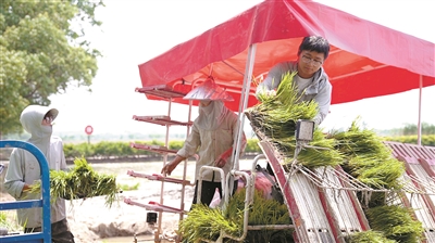 6月18日下午1点多,头顶骄阳似火,海洲街道张店村的田里积水还没退干。董鹏飞开的插秧机“趴了窝”,同事赶紧开来一台“大铁牛”,把它拖了出来。“前几天连阴雨,地里的泥比较烂,这些‘小插曲’其实也很正常。”手上衣服上糊着泥巴,脸上皮肤晒得黑黑,董鹏飞腾不出手去擦脸上的汗,笑着说道。