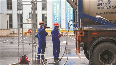 本报讯 时值第24个全国“安全生产月”,为有效预防和妥善处置各类特种设备突发事件,6月24日上午,市市场监管局联合浙江省特种设备科学研究院、浙江英德赛半导体材料股份有限公司,开展了海宁市2025年移动式压力容器充装介质泄漏事故应急救援演练。