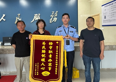 王大姐(左二)和弟弟(左一)为民警送上锦旗。
