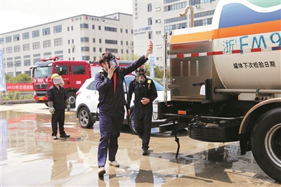 本报讯 为提升危险货物运输突发事故的应急处理能力,筑牢危货运输安全防线,6月27日下午,2025年海宁市交通运输领域安全生产月暨危险货物运输行业综合应急演练在袁花镇正泰气体有限公司停车场举行。