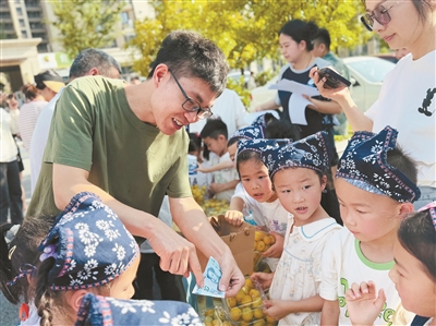 本报讯 “新鲜采摘的李子,又大又甜,一盒10元!”近日,海昌街道中心幼儿园经开分园门前人头攒动,一年一度的“李子爱心市集”如期举行。活动现场,孩子们分工明确,有的化身“小掌柜”热情吆喝,有的担任“收银员”认真计算,将亲手采摘的李子精心分装售卖。