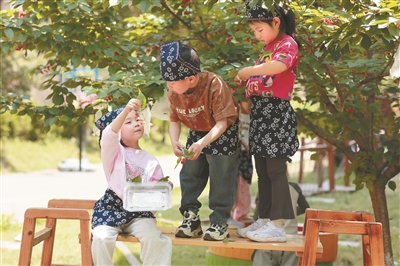 “去年6月,恰逢枇杷丰收,满树的果子多得吃不完,孩子们便萌生了义卖的想法。”张轶文回忆道,“在义卖的过程中,孩子们可以学习市场调研、认识货币等,在实践中丰富社会认知。”如今,每学期初幼儿园都会组织班级果树认领活动,孩子们全程参与果树发芽、开花、结果、采摘等每个阶段,真切感受劳作的艰辛与丰收的喜悦。