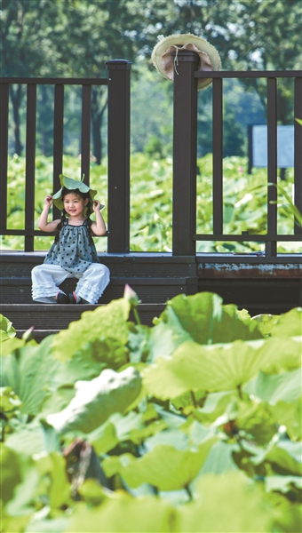 这几日,猛烈的阳光已经让海宁人初尝夏日的火热。在双山村“十里荷塘”,一位小姑娘正头顶荷叶,在日头下寻得一方阴凉。