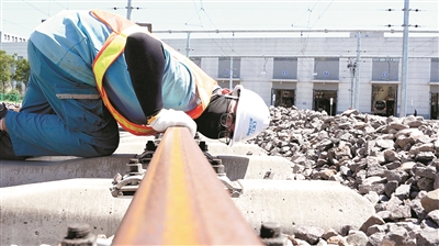 只见李子强俯身跪在车道上,为了看清钢轨下颚线的平整度,脸几乎要贴到钢轨上。“尽可能靠近钢轨才能看清钢轨是否处于一个平面上,确保没有高低水平的误差。如果出现高低不平的情况,要尽快进行处理。”李子强说。