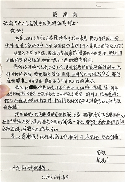 “您的温柔与耐心就像一束光,驱散了我所有恐惧。”李女士在信中动情地写道。她特别提及胡细芳一次次为她擦泪的双手、始终如一的安慰话语以及那关键时响起的音乐,字里行间流淌着对“白衣天使”最深的敬意与感激。