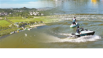 连日高温,亲水运动成为大众休闲的热门选择。这两天,摩托艇等运动热度连续攀升,大尖山迎来四面八方的游客,大家在水上享受速度与激情。