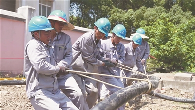 本报讯 “一二三!一二三……”7月5日上午,位于桐乡市崇福镇的110千伏崇福变内,传来国网海宁市供电公司员工整齐有力的口号声。这是我市电网跨区互联工程的施工现场,施工人员头顶烈阳,加快10千伏崇宁、崇海线最后一段电缆的敷设。7月8日,这两条从桐乡跨区而来的“电力长龙”将正式投用。