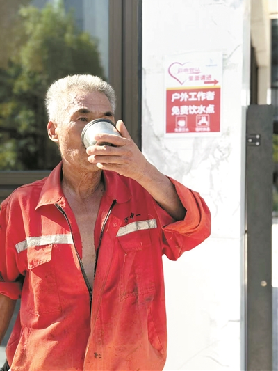 环卫工人严建祥咕咚咕咚灌下半瓶水,满足地擦了擦嘴:“这几天每天要喝4大瓶水,现在有了这些取水点,再也不用背着沉甸甸的水壶上班了。”他笑着说,现在社会各界对环卫工人越来越关心,不仅有避高温时段,还有企业提供纳凉点,“干活都更有劲了。”