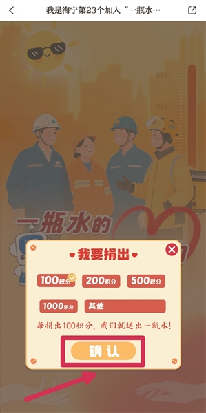 打开大潮APP首页,点击“一瓶水的爱心接力 你捐积分我捐水”宣传图,选择你要捐出的积分数量,点击确认即可。