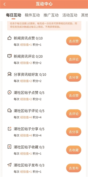 登录大潮APP,点击右下角“我的”,在“互动中心”下方,每日攒积分方式一目了然:新闻资讯点赞、评论、分享,潮社区帖子点赞、评论、分享、收藏等方式都可以赚积分。