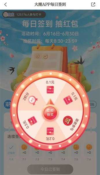 登录大潮APP,点击右下角“我的”,选中当前日期进行签到,就有机会抽奖获得积分。