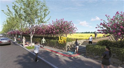 值得一提的是,漫步道景观设计非常有特点,沿途不仅布置了主题雕塑等打卡点,还将种植除虫菊、黄金菊等驱虫植物,建设上百米的紫薇花墙,当紫薇花开的时候,花香伴着稻香,将呈现一幅绝美的田园画卷。
