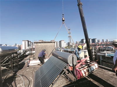 东苑社区拆除屋顶的废弃太阳能热水器。