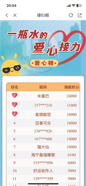 活动中,用户“米曼巴”一口气捐出了24000积分,在爱心榜上遥遥领先。用户“紫微邮匠”“百事可乐”也不甘示弱捐出了10000积分,在爱心榜上名列前茅。