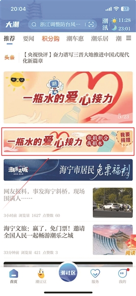 本报讯 7月7日17时,由海宁市传媒中心联合市委社会工作部、市总工会等单位发起的“一瓶水的爱心接力”公益行动上线“‘100积分=1瓶水’你捐积分 我们送水”活动,诚邀每一位大潮APP用户捐赠自己的积分,传递城市的清凉与关爱!