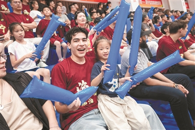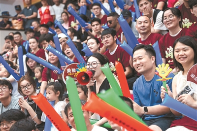 赛场上,比拼激烈;观众席外,呐喊声此起彼伏,有人挥舞着印有“海宁必胜”的旗帜,有人高举着写满鼓励的手绘标语牌,全力为两支球队加油,热情的浪潮一浪高过一浪。