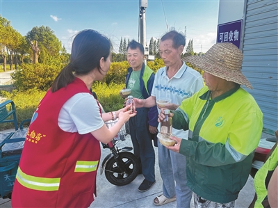 本报讯 高温持续,在田间地头、垃圾清运站等场所,清扫村道的保洁员仍在忙碌地工作中。近日,盐官镇联农村工作人员带着消暑饮品,为这些户外劳动者送上“清凉”。除了常见的银耳莲子汤等传统饮品,一杯杯色泽清亮、散发着草本香气的紫苏茶饮格外引人注目。