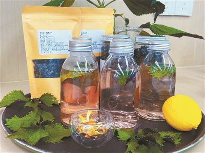 紫苏作为药食同源的植物,其饮用历史颇为悠久,有记载可追溯至宋代。这次联农村送出的紫苏茶饮,在借鉴传统的基础上进行了一定改良。先将紫苏茶、陈皮与少量甘草加水蒸煮,随后冷却并加入柠檬汁混合,原本橙黄的饮品瞬间变得粉嫩,待自然冷却后即可饮用。