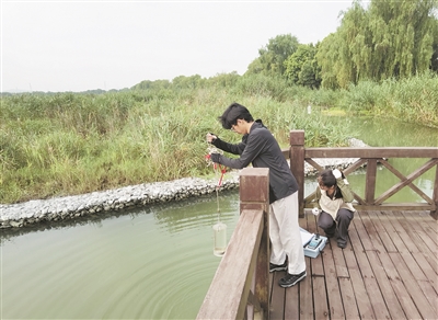 两人从进水口开始,对每个功能区里关键点位的水质逐一采样,现场检测水中PH值、溶解氧和浊度等数值。每到一个点位,孔繁果负责取水样,朱舒婷则负责操作检测设备、记录数据。两人分工协作,配合默契。