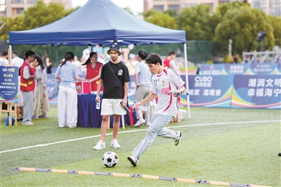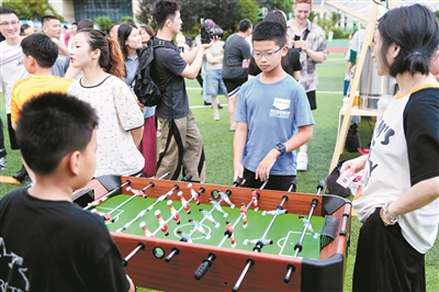 赛场内激烈对决,赛场外也热闹非凡。“潮城十二道风味”集市里,20多个摊位摆满各镇街的宝藏美食和文创;互动区里,九宫格射门挑战前总有人跃跃欲试,桌式足球赛更是成了亲子乐园,爸妈带着娃组队PK。