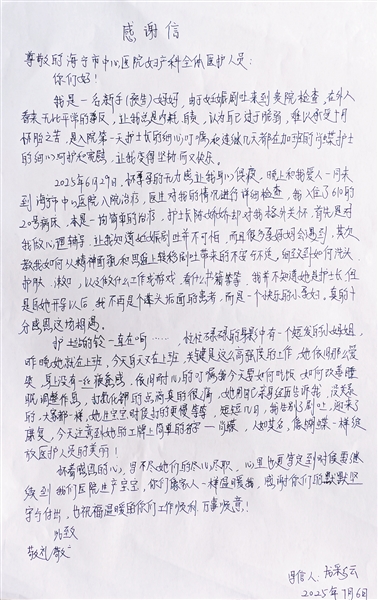 这一份份温暖让龙彩云萌生了写感谢信的念头。“有太多细节想写,一张纸根本不够。”龙彩云说,其实像陈娇娇、肖蝶一样的护士还有许多,甚至很多护士她都没能知道名字,但她们给了她很多关心。她想要感谢的也不仅仅是这两位护士,而是中心医院妇产科整个医护群。出院时,她特意询问将来能否在这里生产,“她们的专业和暖心,让我完全信赖。”