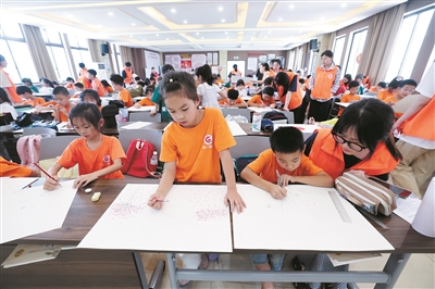 7月23日,志愿者在西山社区党群服务中心的暑期爱心教室辅导孩子们画画。暑假期间,硖石街道西山社区党群服务中心开启暑期“爱心教室”,课程包括绘画、书法、阅读、手工以及作业辅导等。150余名幼儿园及小学的孩子由大学生志愿者和社工陪伴,开启为期45天的暑期成长之旅。硖石街道西山社区外来新居民较多,从2010年开始,社区利用党群服务中心创办“爱心教室”,采用“专业社工+志愿者”的模式,为孩子们托起多彩假期。(来源新华社) ■新华社记者 徐昱 摄