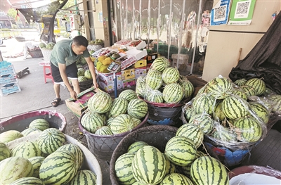 在某果业批发店里,出售的是江苏盐城的西瓜。店主告诉记者,等这批西瓜售完后,接下来出售的就是从陕西运来的西瓜了,一天销售量保持在1万斤以上。