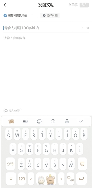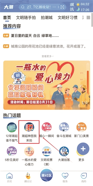 打开大潮APP,点击底部“潮社区”。进入潮社区后,选择热门话题中的“潮超神图我来拍”,进入话题页面,选择发帖形式,写上你的留言内容,点击发布即可。