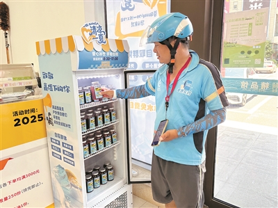 外卖骑手在“爱心冰箱”取解暑饮品。