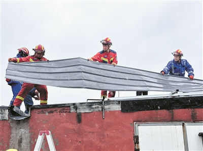 此时,村委会工作人员与民警已对现场交通进行疏导,划定警戒区域。消防队员携带破拆工具,冒着风雨攀上湿滑的楼顶。“必须逐块拆除,不能让碎片二次坠落!”指挥员在风雨中大喊。队员们分工协作,有的切割连接部件,有的搬运拆卸下的钢板,雨水混着汗水浸透了战斗服。经过一个多小时的紧急作业,所有存在隐患的彩钢棚被安全拆除,险情彻底解除。