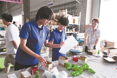 商品包装实操环节,则让学生有了更深刻的实践体验。在仓库工人的指导下,学生们亲手进行包装,体验商品封装等操作,切身感受到包装工作需要兼顾商品保护、成本控制和物流适配等多重因素,真正体会到“细节决定效率”的行业准则。