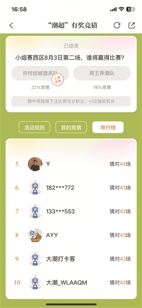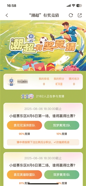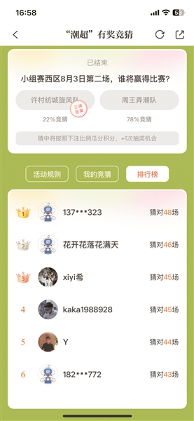 每场竞猜结果揭晓时,如用户竞猜正确,可拿回消耗的积分,并且基于用户消耗的积分比例,瓜分竞猜错误的用户消耗积分总和,同时可获得一次抽奖机会,奖品有积分(8、12、22积分随机)、红包、“潮超”应援帆布袋。如竞猜错误,则无法拿回消耗的积分。
