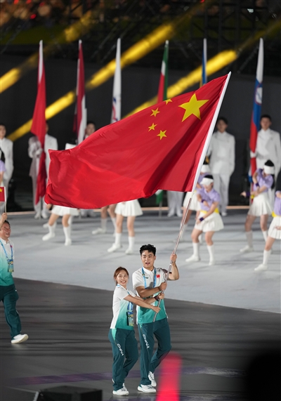 8月7日,第12届世界运动会开幕式在成都举行。中国体育代表团旗手郭丹(左)与史经纬在开幕式上入场。 ■新华社记者 江宏景 摄