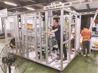 近日,记者来到位于长安镇、高新区的海宁量益智能装备有限公司,千余平方米的研制车间里,清脆的金属碰撞声不绝于耳,空气中弥漫着淡淡的机油味。车间的货架上摆满了各种机械装配件和拆装工具,柯海森和团队成员正在埋头组装、调试无人机物流柜的控制系统。