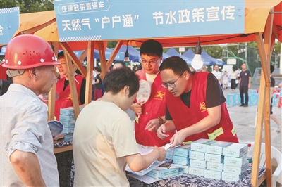 晚上7点,露天电影准时开播。孩子们凑在前面看得津津有味,大人们坐在后面边看边聊,像一场热闹的邻里聚会。天气炎热,现场还为市民提供免费的凉茶、绿豆汤,为大家消暑。